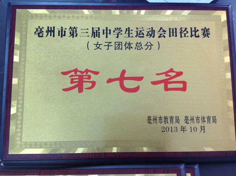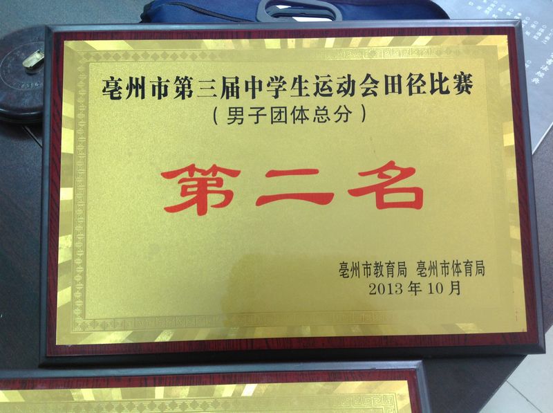 经过四天的拼搏奋战,我校荣获8块金牌和8块银牌,获男子组总分第二名,女子组总分第七名,男女团体总分第三名的优良成绩。其中,赵廷凯同学以23.06秒的成绩破亳州市200米跑记录,并荣获冠军;以11.11秒的成绩破我校100米跑记录,并荣获冠军。赵廷凯、王昊等四位同学以44.68秒的成绩破我校4×100米跑记录,并荣获冠军。王昊荣获100米跑银牌和200米跑银牌。王思远荣获三级跳远银牌。赵廷凯等四人荣获4×400米银牌。崔智、纪伟光、袁立志、王晓阳四位老师荣获优秀教练员称号。李志强老师荣获优秀裁判员称号。赵廷凯、郭舜琪、王思远、李铭铭、都杨玲、徐松慧六位同学荣获优秀运动员称号。