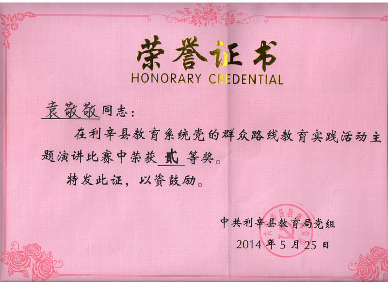 袁敬敬老师路线教育演讲获奖证书